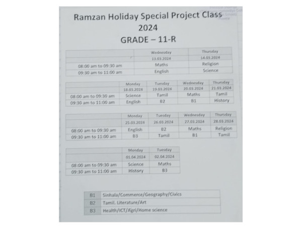 நோன்பு விடுமுறை காலப்பகுதியில் க.பொ.த (சா/த) மாணவர்களுக்கு மேலதிக வகுப்புக்கள் நடத்தப்படும்.
